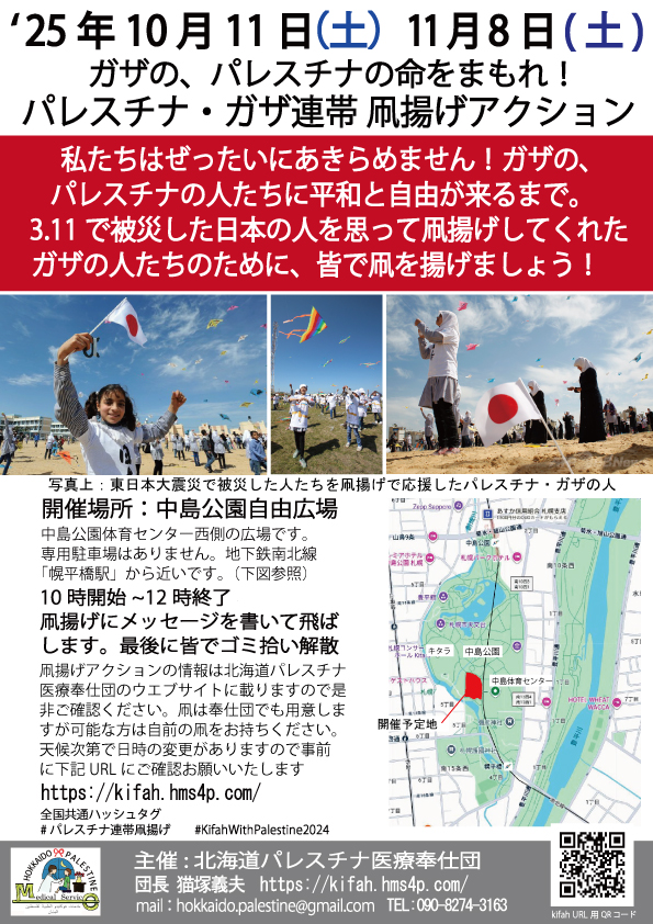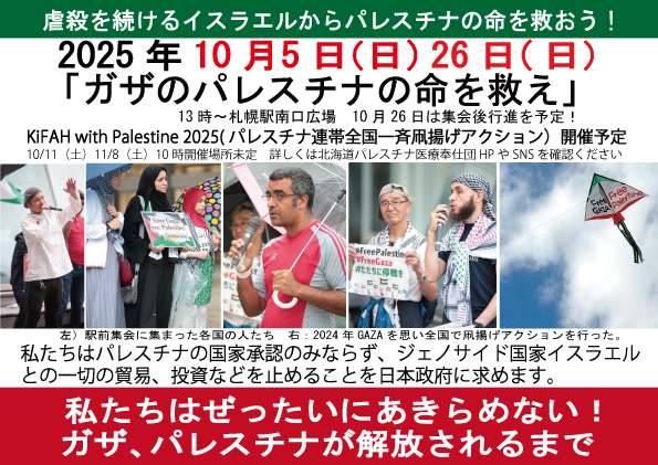 パレスチナ・ガザ地区で続いている、イスラエルによる国際法違反のジェノサイド(大量虐殺)に抗議する定例スタンディングです。毎週土曜日14:00~札幌パルコ前で行っています。
