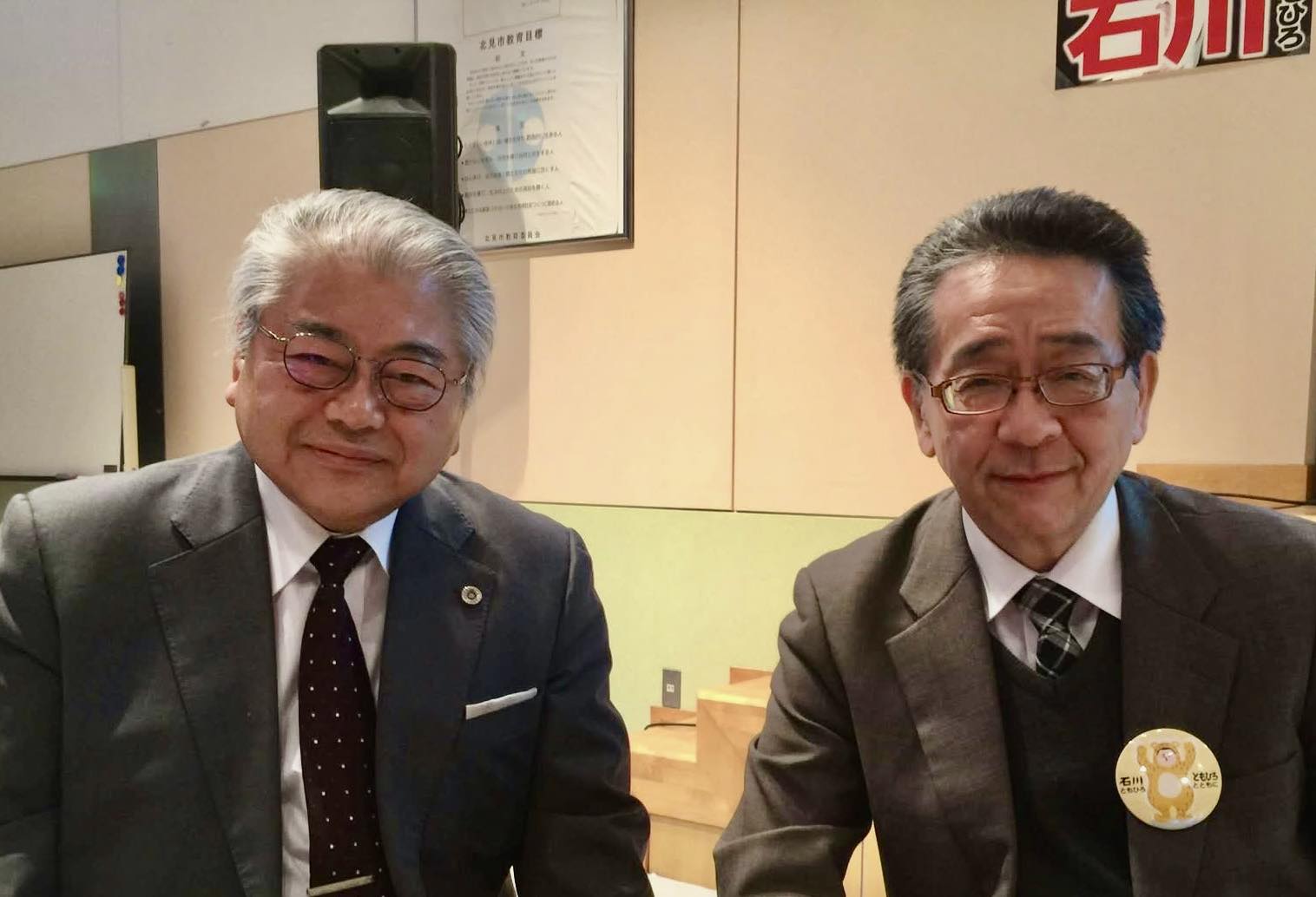 私が上田さんと一緒に活動したのは2015年から2020年までの6年間くらいの間でした。私のパソコンには上田さんの写真データが何枚もありますが、私が撮影していますので、二人が一緒に写っているツーショット写真はこれくらいです。これは2019年の道知事選の時に、石川知裕さんの選挙応援のために全道各地を二人で駆け回っていた時の写真です。この頃は、フミオ&シゲオとか言って、二人でかけあい漫才みたいな対談の講演をよくやっていました。私の企画で、横路孝弘さんと上田文雄さんの二人を並べて、私が司会をして対談をしてもらったこともありました。いまは二人とも逝ってしまいましたが、本当に北海道のリベラルの二大巨頭だったと思います。今頃、あの世で、二人で「これからのリベラルはどうなるのかねぇ」なんて話し合っているかもしれませんね。(川原茂雄・元共同代表)