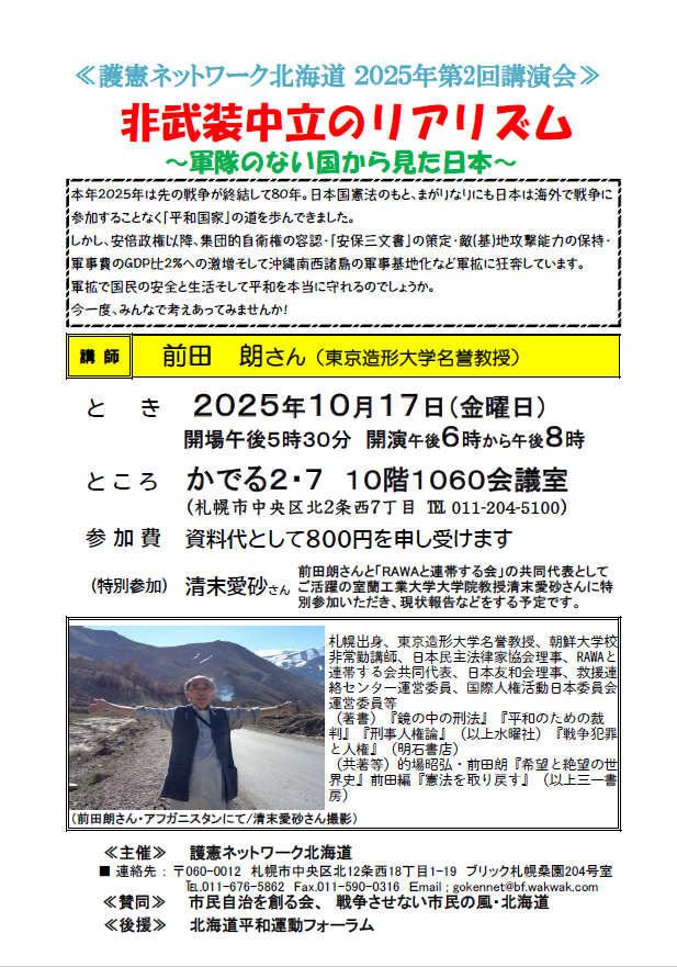 8月27日(水)18:30~札幌エルプラザ4F大研修室にて、標記の講演会が行われました。「戦後」80年ピースデイズ2025企画として市民の風が主催した講演会です。