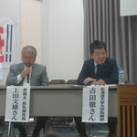 私が上田さんと一緒に活動したのは2015年から2020年までの6年間くらいの間でした。私のパソコンには上田さんの写真データが何枚もありますが、私が撮影していますので、二人が一緒に写っているツーショット写真はこれくらいです。これは2019年の道知事選の時に、石川知裕さんの選挙応援のために全道各地を二人で駆け回っていた時の写真です。この頃は、フミオ&シゲオとか言って、二人でかけあい漫才みたいな対談の講演をよくやっていました。私の企画で、横路孝弘さんと上田文雄さんの二人を並べて、私が司会をして対談をしてもらったこともありました。いまは二人とも逝ってしまいましたが、本当に北海道のリベラルの二大巨頭だったと思います。今頃、あの世で、二人で「これからのリベラルはどうなるのかねぇ」なんて話し合っているかもしれませんね。(川原茂雄・元共同代表)